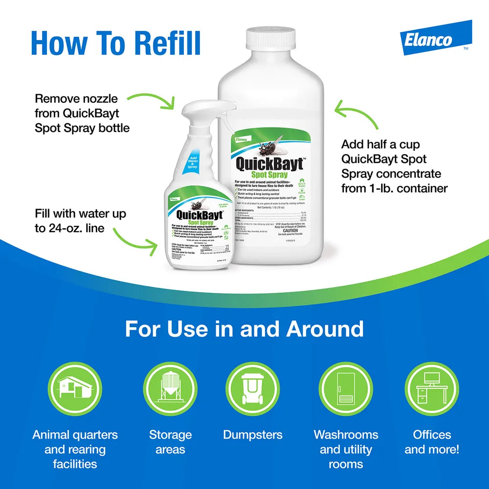 QuickBayt Spot Spray for horses and stable environments. Professional-grade Elanco fly control solution.