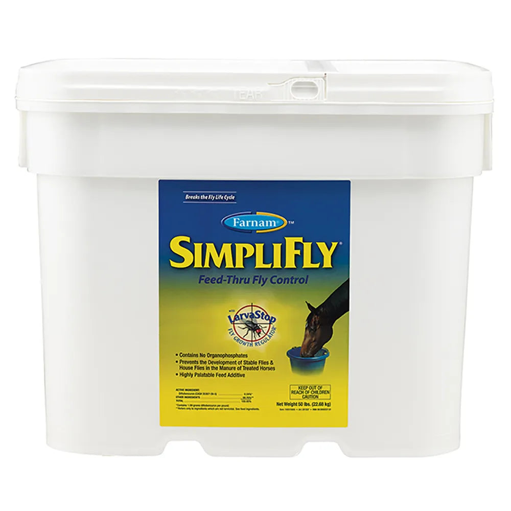 Farnam SimpliFly Feed-Through Fly Control is a proven supplement formulated to reduce stable and house fly populations by targeting flies at the source. Designed for daily use, SimpliFly works in the manure to prevent fly larvae from developing into mature biting flies.